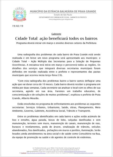 A partir de março todos os bairros de Praia Grande receberão gradativamente o programa CIDADE TOTAL – Ação múltipla das secretarias para a solução de pequenas ocorrências.